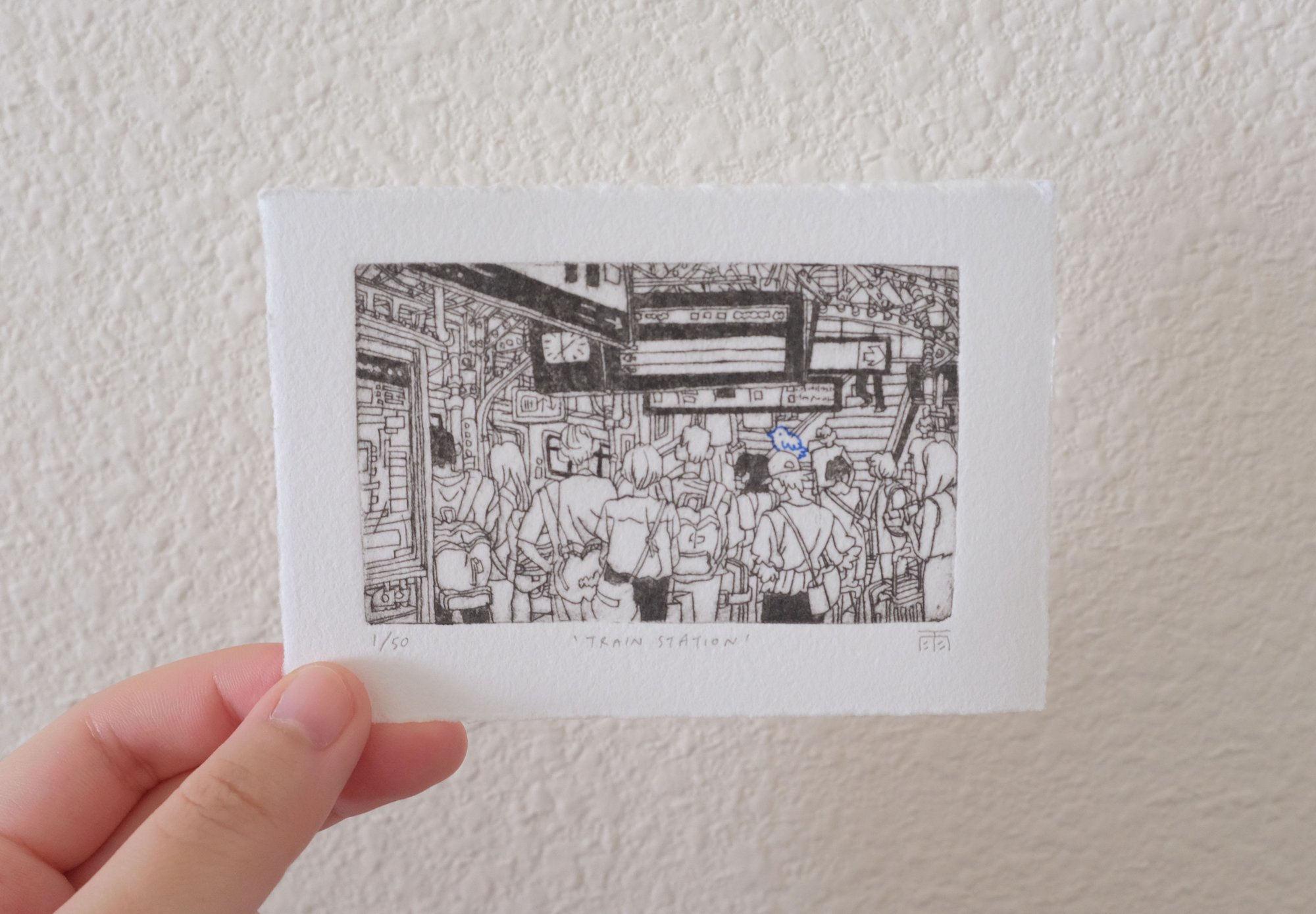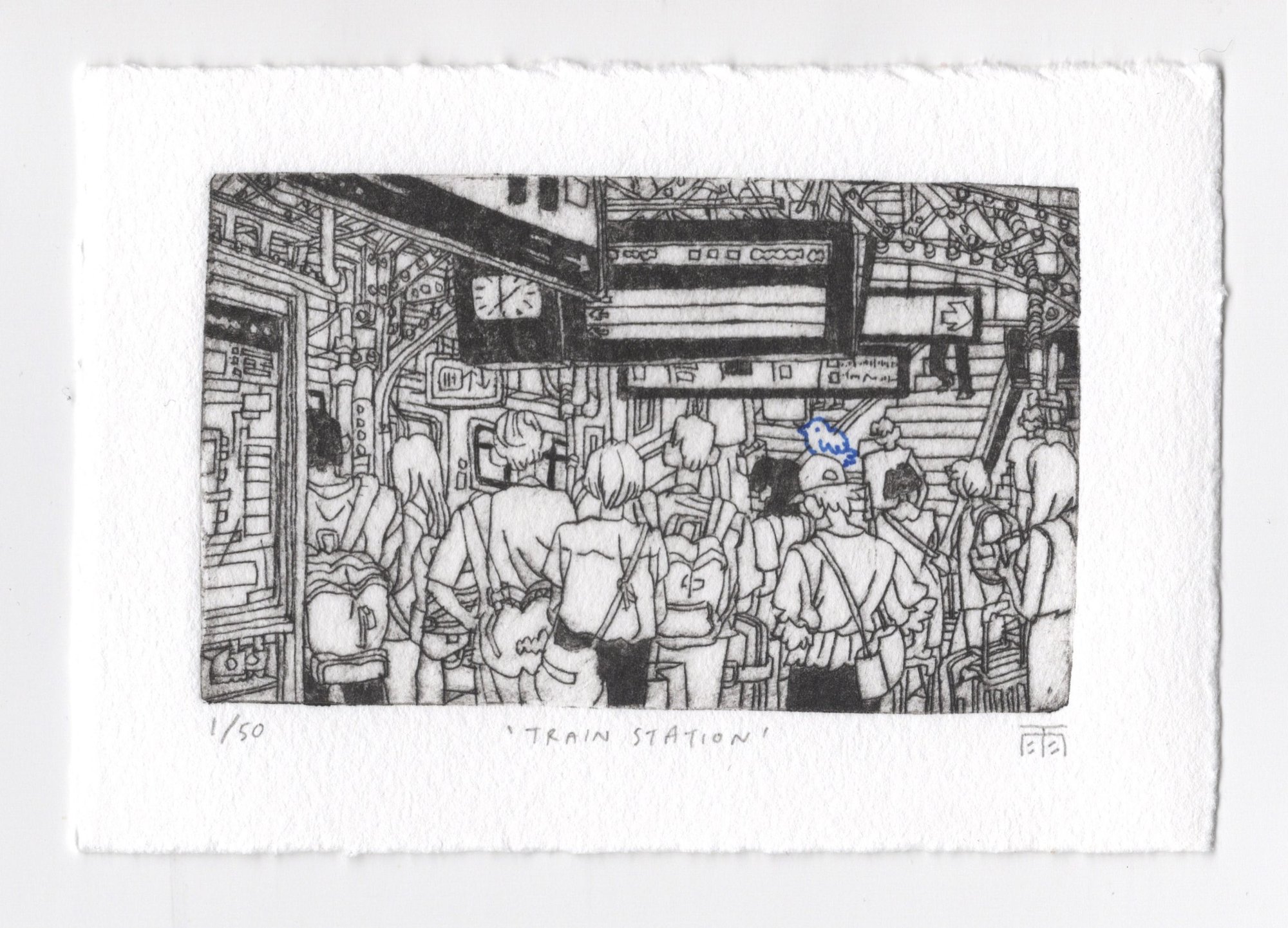 A hand-modified drypoint print of "Train Station". Limited edition of 50.